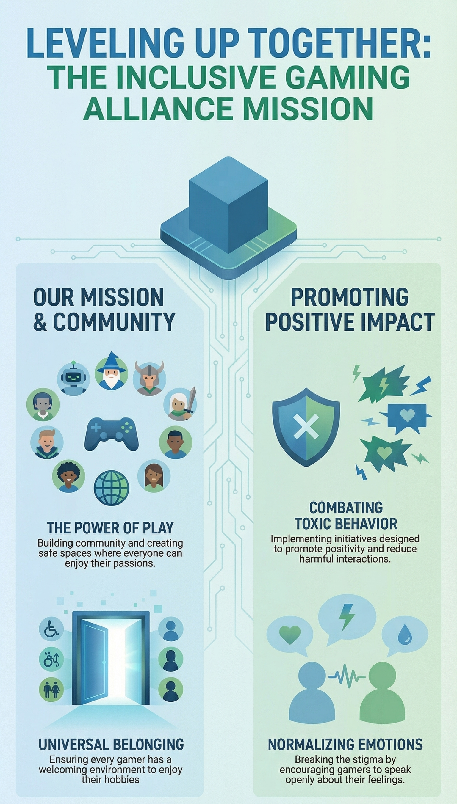 We believe that everyone deserves to have a safe and welcoming space to enjoy their hobbies and passions. Through our programs and initiatives, we are working to combat toxic behavior, normalize talking about emotions, and promote positivity in the gaming world.